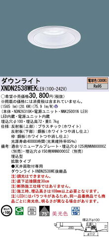 【最安値挑戦中!最大22倍】パナソニック XNDN2538WEKLE9 ダウンライト 天井埋込型 LED(電球色) 美光色・浅型10H・拡散75度 埋込穴φ100 ホワイト [∽]